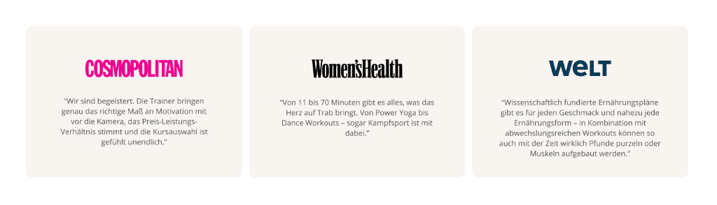 Gymondo wird von einer Reihe von bekannten Zeitschriften und Websites empfohlen. Die Abwechslung im Programm bei Gymondo, ist den meisten Testern äußerst wichtig und wird regelmäßig hervorgehoben.